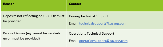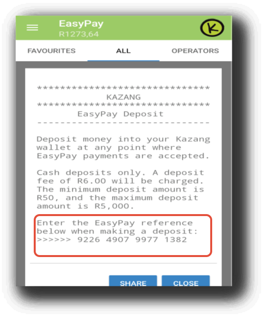 The Easypay deposit function is only available for cash deposits because using a credit/debit card may result in Kazang being charged slightly more by retail stores. R5000 is a maximum amount that a vendor can deposit at a time, but they are allowed to perform multiple deposits if the cashier/teller allows.