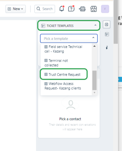 2) Once on the new ticket page, navigate to "ticket templates" on the right. From the dropdown menu, select "Trust centre request".