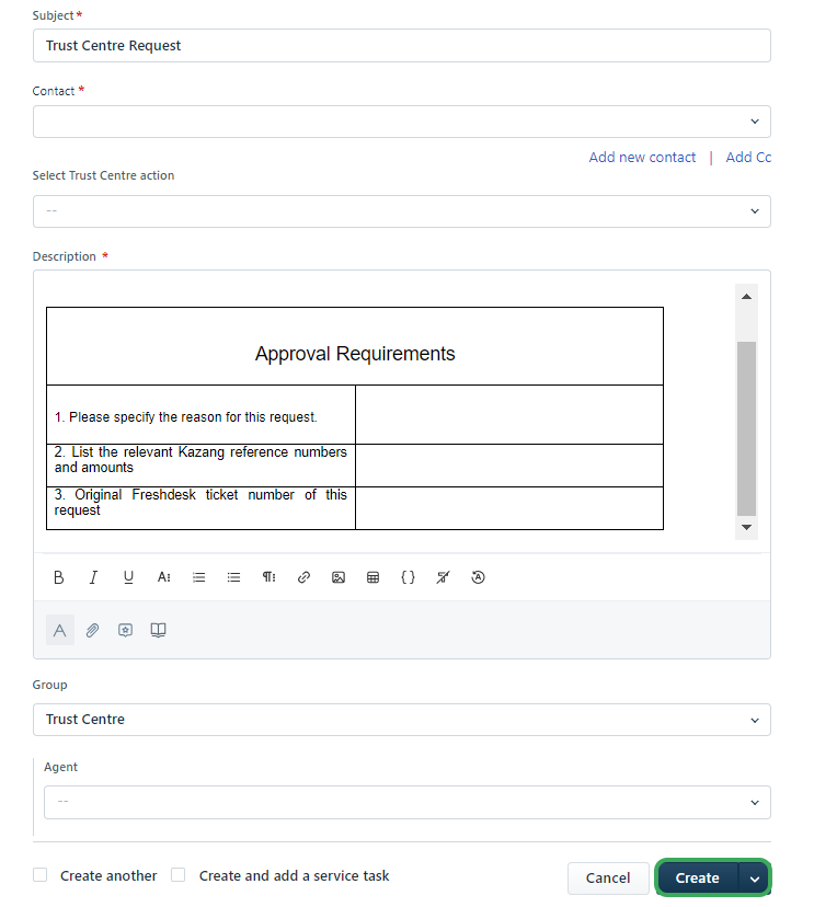 * Description – Enter the reasons for the request and specify the relevant account (reference) numbers and amount/s as well as the Freshdesk ticket number relating to this request.