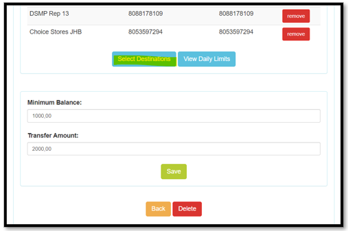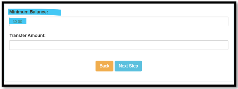 | Step 4 | Insert both the "minimum balance" and the "transfer amount" | Minimum balance will determine which balance on the receiving account will trigger the main account to transfer funds to the receiving account. Transfer Amount will decide how much the main account will transfer each time this rule is triggered. | ![]() |