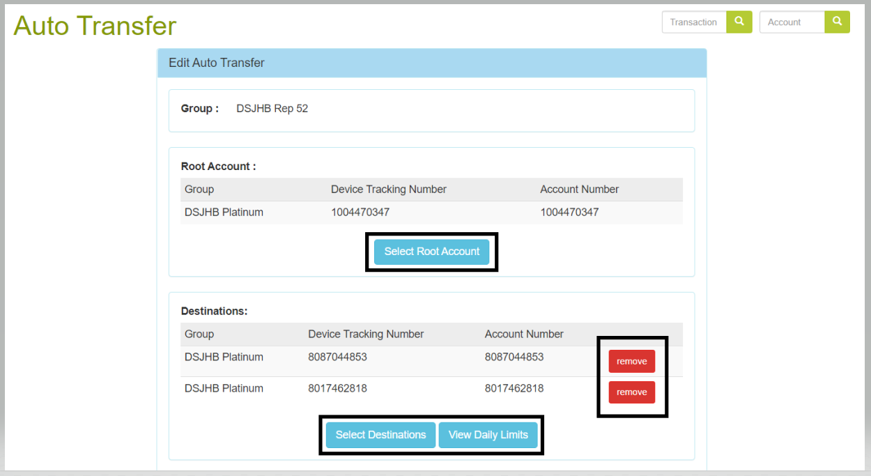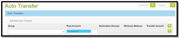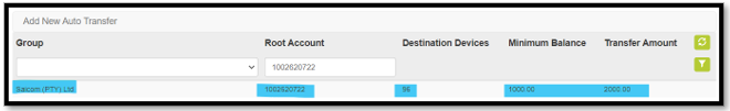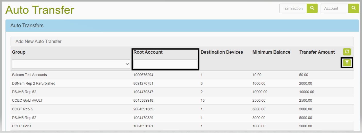 | Step 1 | Insert the root account number and click on the filter icon | On the result page you are also able to see the root account, how many destination devices are linked, the minimum balance that triggers auto transfer and the transfer amount. | ![]() |