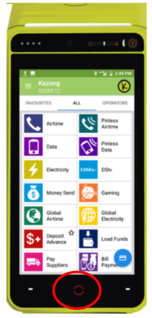 | Step 1 | Click on the Home Button of the Kazang device | ![]() |
