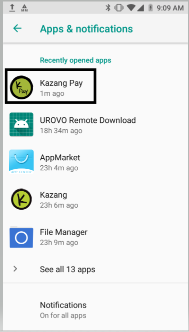 | Step 3 | All apps currently installed on the device will now be displayed. Select the Kazang Pay App | ![]() |
